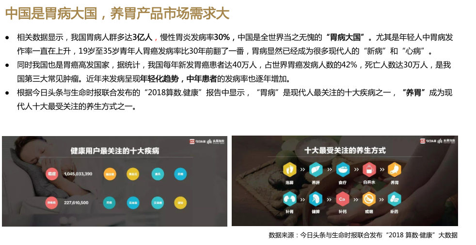 (3)養(yǎng)胃被重視:根據(jù)今日頭條與生命時報聯(lián)合發(fā)布的“2018算數(shù).健康”報告中顯示,“胃病”是現(xiàn)代人最關注的十大疾病之一,“養(yǎng)胃”成為現(xiàn)代人十大最受關注的養(yǎng)生方式之一。
