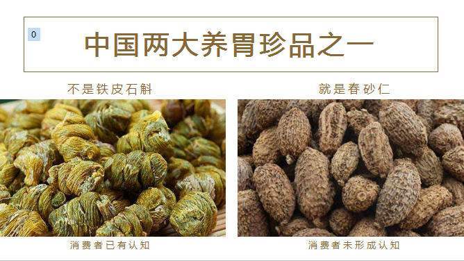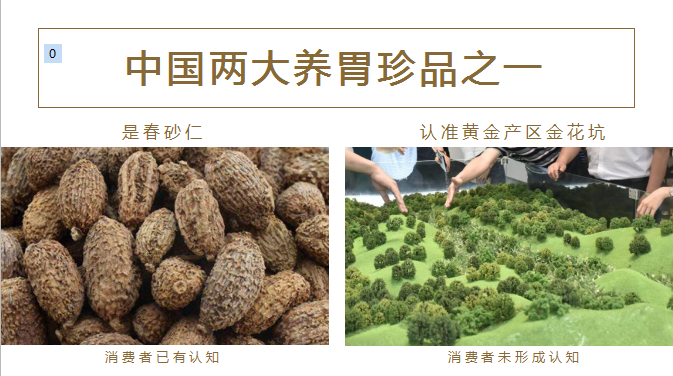 (1)中國已進入第三輪消費升級,大健康產(chǎn)業(yè)成下個潛在風口,藥食同源類產(chǎn)品需求旺盛,陽春砂仁作為清朝皇家養(yǎng)胃貢品,卻被遺忘在歷史的長河中。消費者心中有高麗參、鐵皮石斛、冬蟲夏草的滋補認知,卻無金花坑陽春砂仁的心智認知。