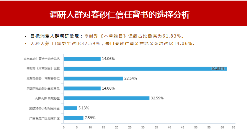 通過目標人群調(diào)研可見:消費者對春砂仁信任背書的選擇,更傾向于李時珍《本草綱目》記載。
