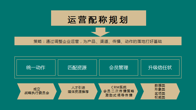 最后,通過調(diào)整企業(yè)運營,為產(chǎn)品、渠道、傳播、動作的落地打好基礎。在行動上統(tǒng)一動作,在資源上合理匹配,在用戶沉淀上做好會員管理,同時不斷升級品牌信任狀,提升行業(yè)權威。