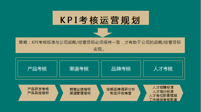 為確保公司戰(zhàn)略與運營政策有效的執(zhí)行,合適、合理、合情的KPI考核標準也是必不可少的。產(chǎn)品考核、渠道考核、品牌考核、人才考核每一環(huán)都不容忽視,KPI考核標準與公司戰(zhàn)略/經(jīng)營目標必須保持一致,才有助于公司的戰(zhàn)略/經(jīng)營目標實現(xiàn)。